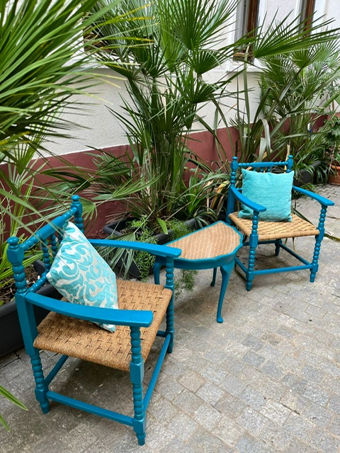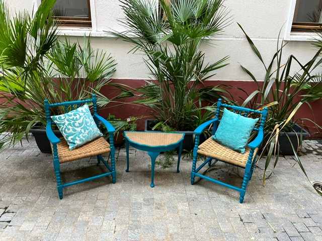 Coppia di poltrone con struttura in rovere trattata a cera con imbottitura. Il restauro dell’imbottitura è stato eseguito da sapienti maestri tappezzieri con tessuti di alto pregio. Il tessuto presenta nella prima poltrona una texture che alterna due torni di grigio, da quello scuro a quello perla, nella seconda poltrona invece prevale il grigio perla su un pattern a fiori.